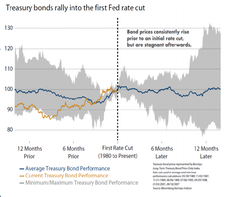- Bond prices consistently rise prior to an initial rate cut, but are stagnant afterwards.