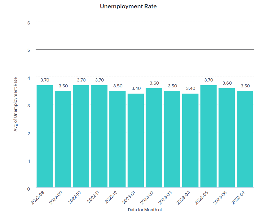 The unemployment rate has been pretty stable over the past year, according to the Bureau of Labor Statistics. In fact, despite the four-week average of initial jobless claims moving slightly higher this year, the unemployment rate sits lower than a year ago, at 3.50%, much lower than the theoretical rate of "full employment". Continued claims for unemployment insurance are also lower than before the COVID-19 pandemic began (1,879,000 for the week ending 1/4/2020; 1,716,000 for the week ending 8/5/2023).