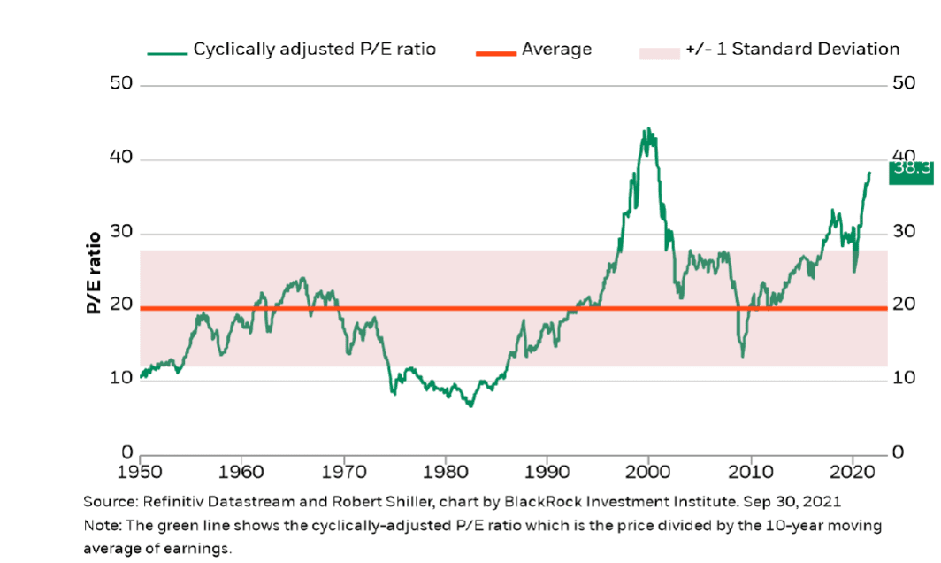 By some measures, the S&P could be considered overvalued in both the short- and long-term. The long-term implication of being overvalued is that we may have an extended period of sub-par returns in order to revert to the historical average. The Cyclically adjusted P/E Ratio (also called the Shiller CAPE Ratio or P/E 10) takes inflation into consideration over a 10-year period and adjusts earnings accordingly. The PE 10 for the S&P 500 ended the quarter around 38.3, the highest reading since the tech bubble of the early 2000s.
