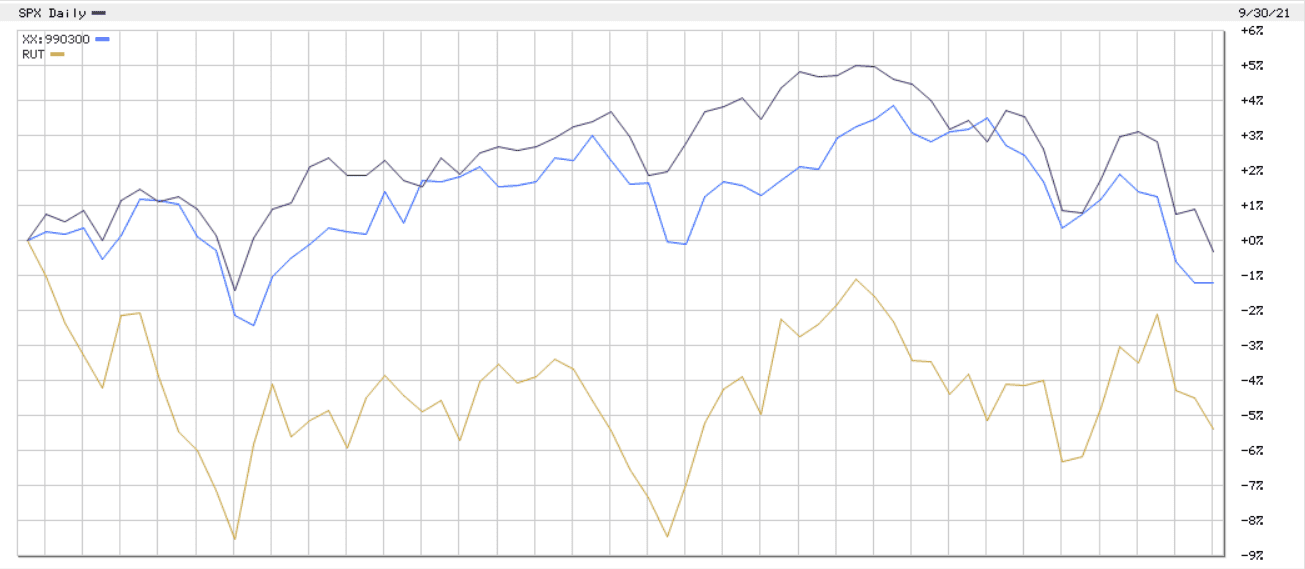 S&P 500 (large cap/black line) and and the MSCI EAFE (international/blue line) were flat, decreasing about 5% in September alone, and the Russell 2000 (small cap/beige line) declined about 5% for the quarter.Valuation Still Matters